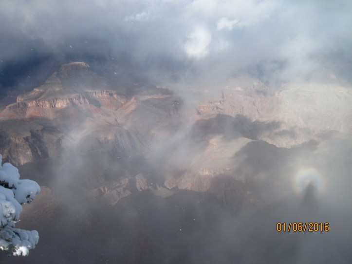 February 9, 2016March 2, 2016Wildefeathers IMG_0243 The sun below and the clouds above made for some very surreal shots. You can see the Glory (The rainbow around the shadow of my head.) in the lower right-hand corner.